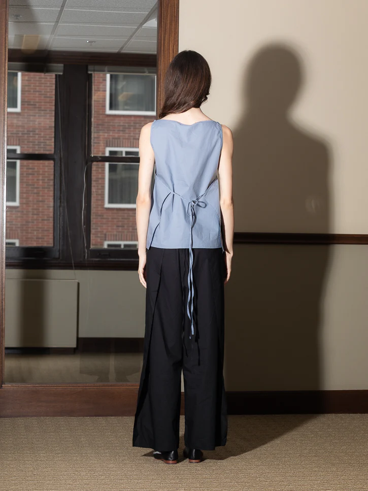 Airy trouser with loose fit, side panels that can be tied in front and back for interesting variations that change the look, particularly from the side view. Elastic waist, side pockets.