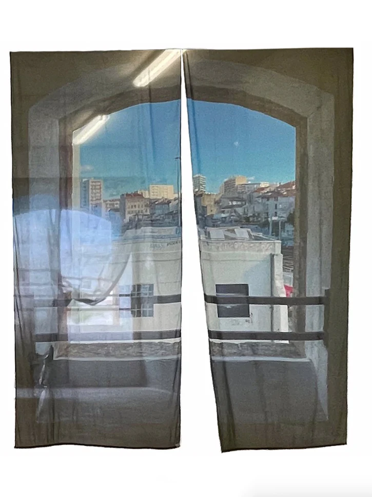 New in their series of domestic objects, linens, curtains, examinations of home and travel and friendships and work life and how it all comes together to bring comfort and memories to bear, even as time marches relentlessly forward. This set is two panels, image taken on holiday in Marseille, France. A view out the window on to another world, a new way of dreaming. The bottoms are weighted, good for either draping or a nice, even hang.Â