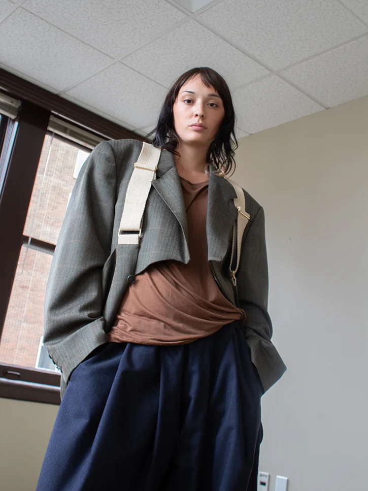 A fantastic new version of this longtime collaborative style, originally developed with Stand Up Comedy as part of its No. 46 Contemporary Remediation collection. This new addition to the collection is a two-piece style, able to be worn separately. These one-of-a-kind pieces are sourced from vintage blazers, and remade into a cropped suit jacket, paired with a variation on the original Demimoore Bag.Â