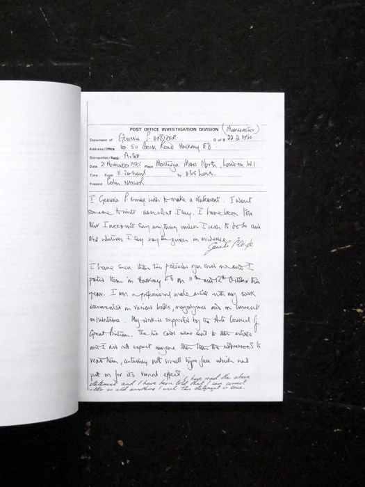 The case: In 1975, Genesis mails two postcards to friends/fellow artists. The cards exemplified he/r practice of collage and mail art. The cards in question contained images of pornography and the Queen. Scotland Yard confiscated the cards, and the G.P.O. lodged an indecency prosecution against he/r. Thus began a legal battle, a fantastic public discourse on the nature of art, and a durational performance work that embodies many of the artistic issues P-Orridge and others were grappling with at the time. The ephemera (correspondence, legal documents, articles, trial issuances, more mail art) was originally compiled into a 1976 publication by Ecart, and is reproduced here by Primary Information. Edition of 1000.Â
